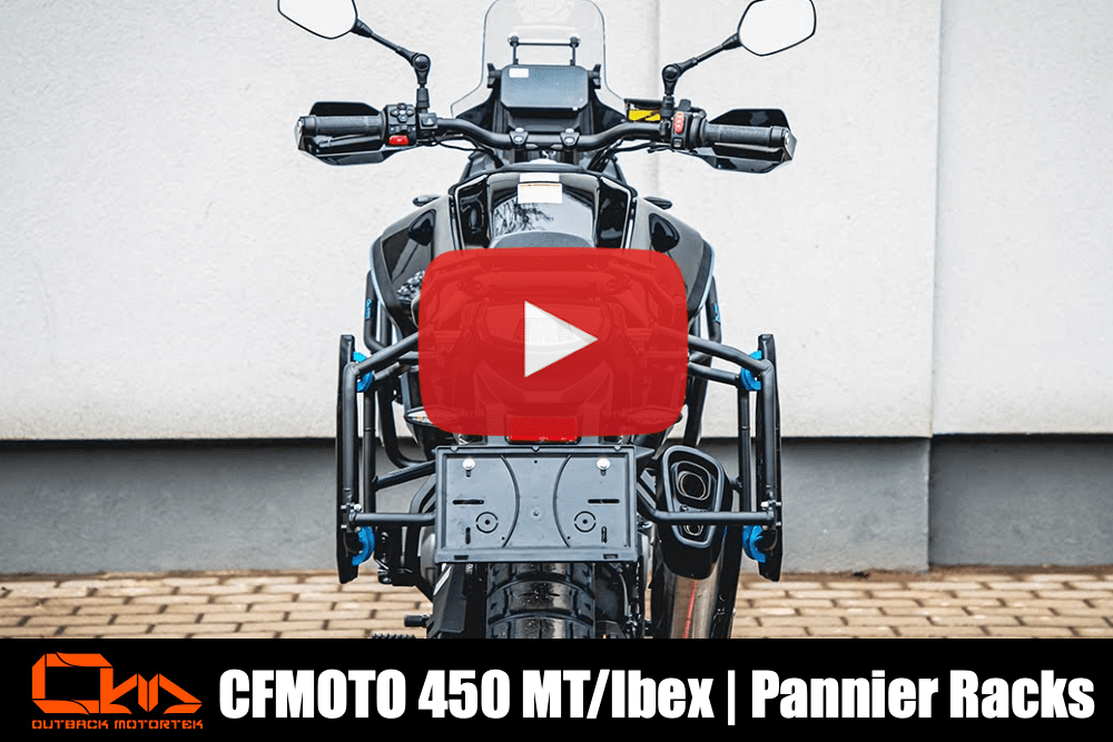 Our pannier racks are constructed of mild steel, which is what makes them robust enough to hold your luggage and absorb impact from drops and tip overs if things go south! Additionally, they have standardised dimensions [350mm (L) x 250 (H) made of 18mm diameter tubing] which gives you the option of mounting a wide range of panniers. The pannier racks for the CFMoto 450MT are available with an asymmetrical design with (TBA)cm in width once installed!