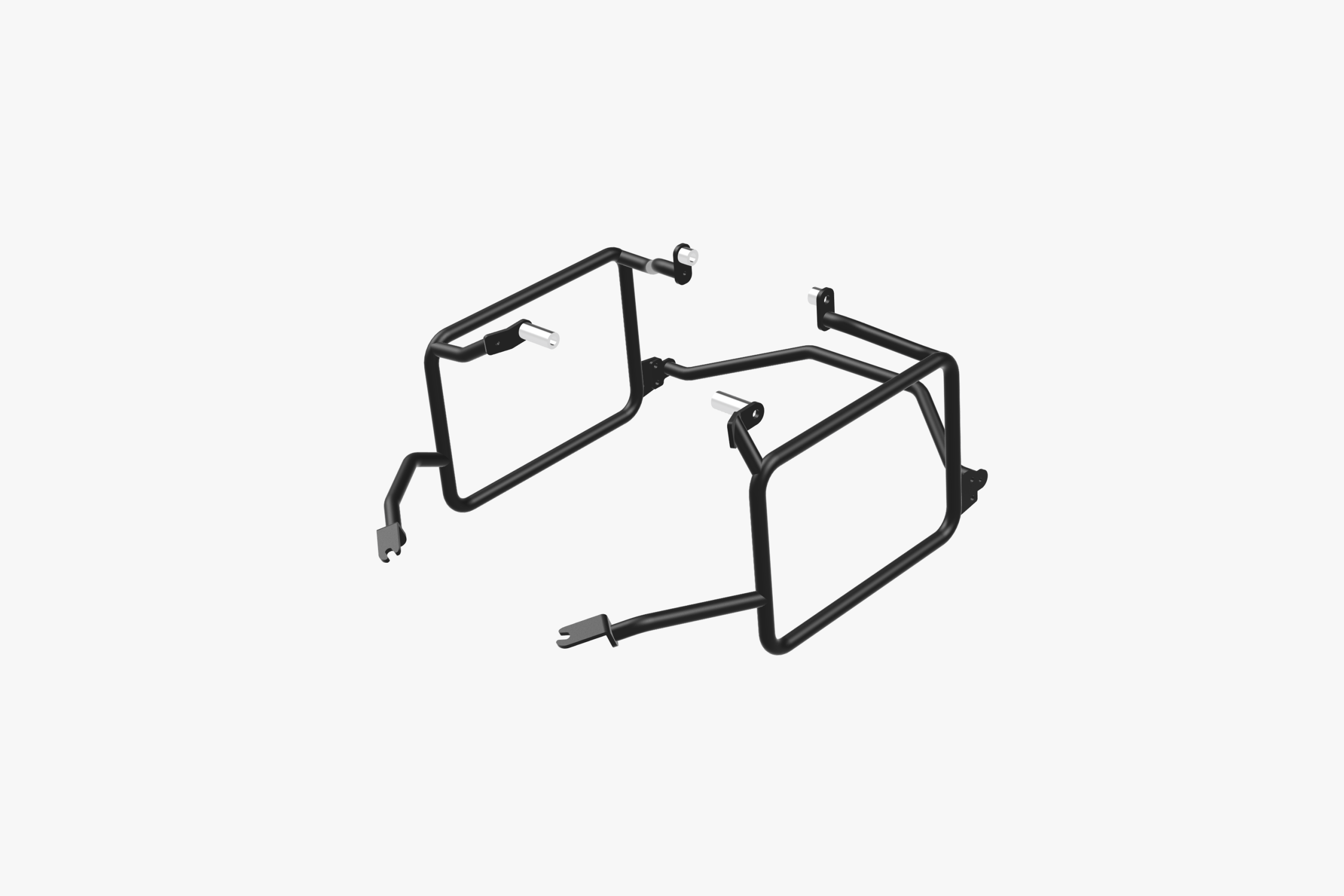 Matte black powder-coated mild steel frames with an alloy X-bracket with multiple Rotopax mounting positions for custom weight distribution, as well as multiple tie-down points. You can even remove the X-Bracket from your frames when running Hard Luggage to reduce the frame weight.