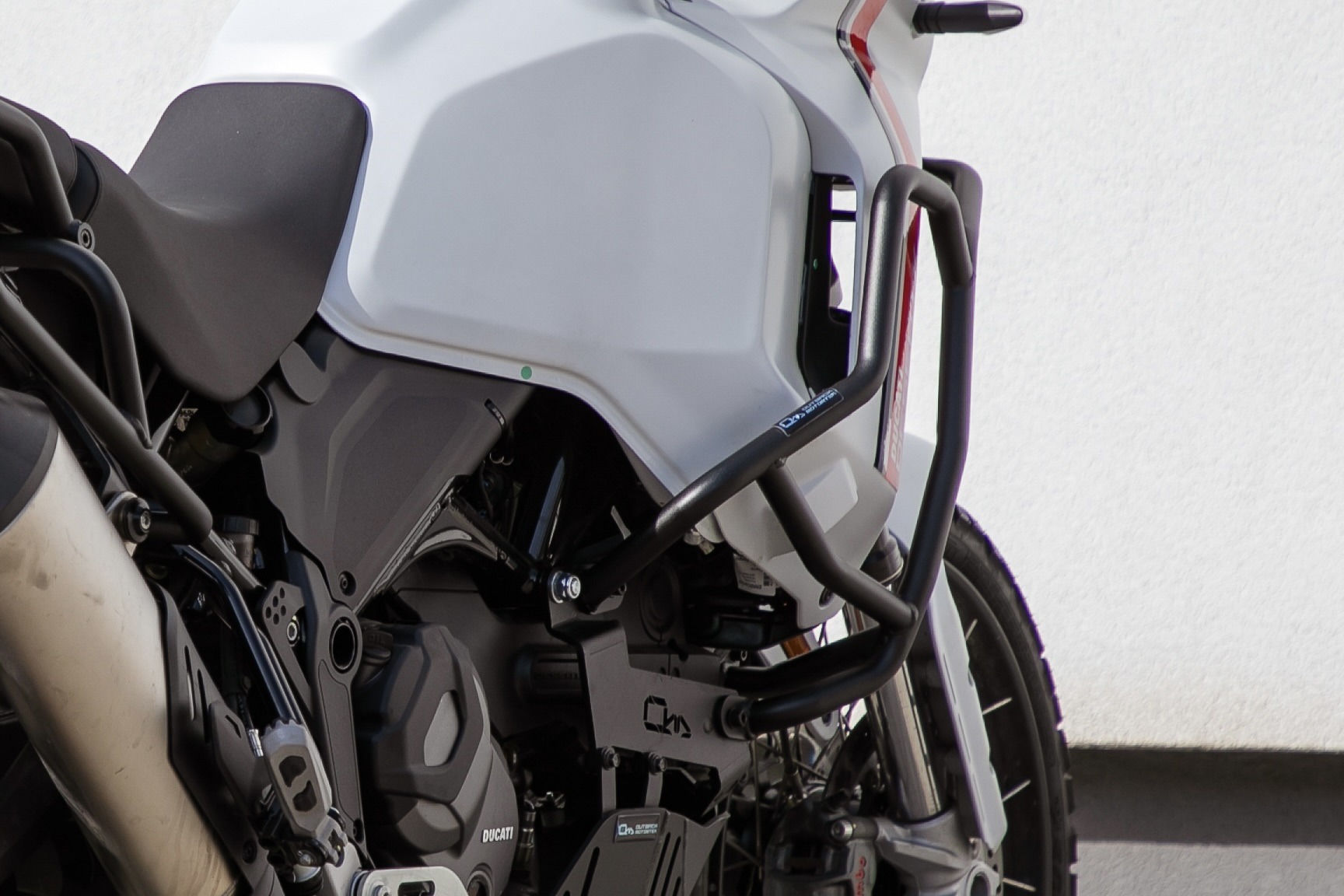 Set of Crash Bars for the Ducati DesertX gives it the protection it requires in case of any upset on the tarmac and also when you decide to further explore out of it. Have fun on your bike, knowing that the tank and all the plastic parts of your bike are much safer. Any possible damage to the whole front of the bike (fairings, tank, suspension and even headlights, turn signals and radiator) will be considerably minimised.