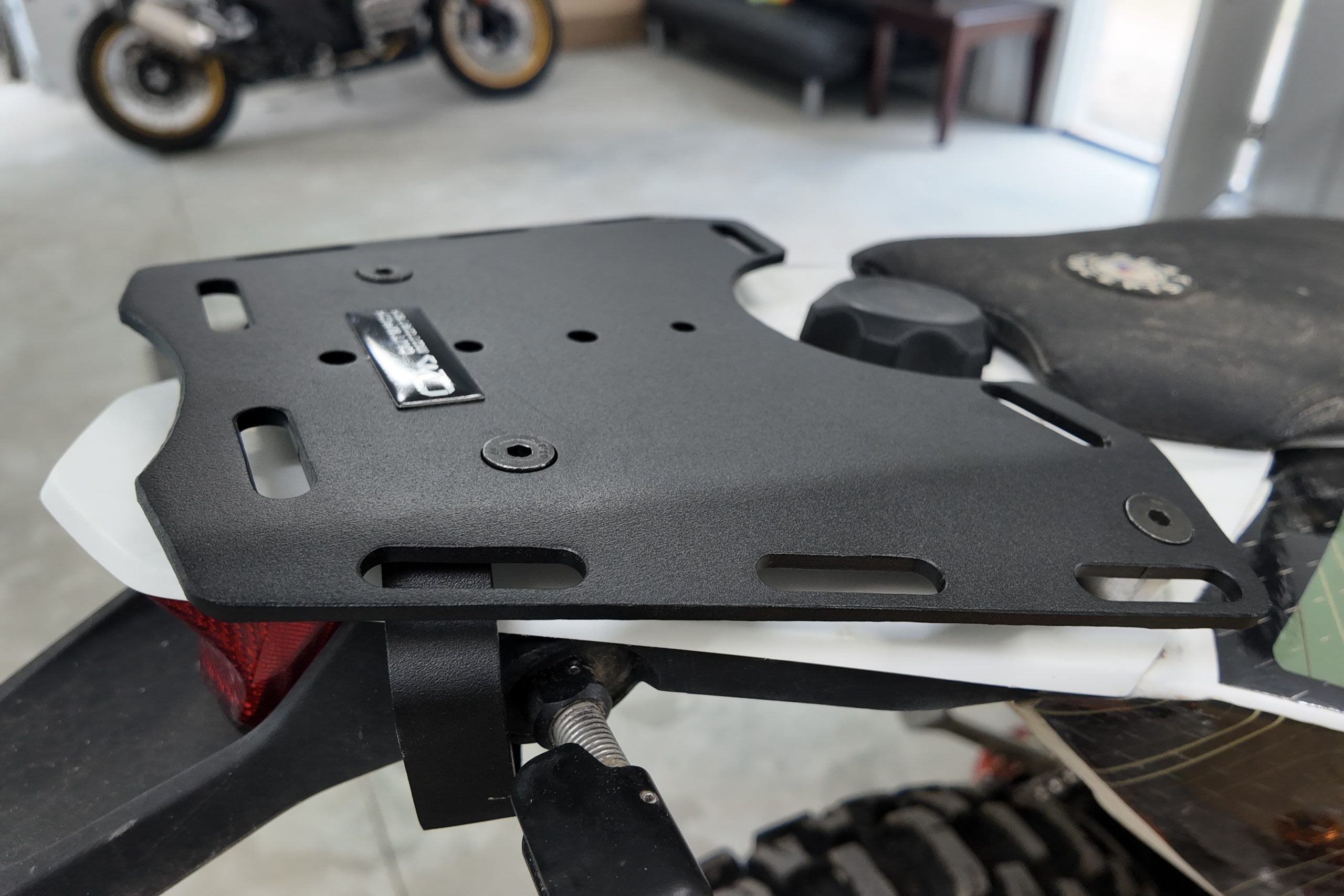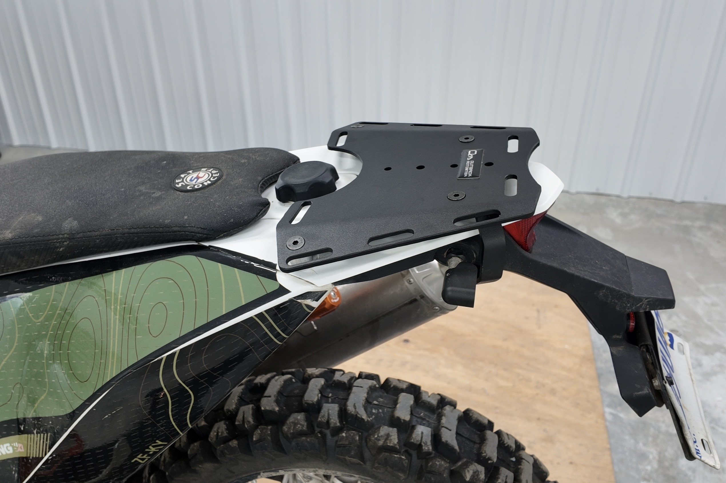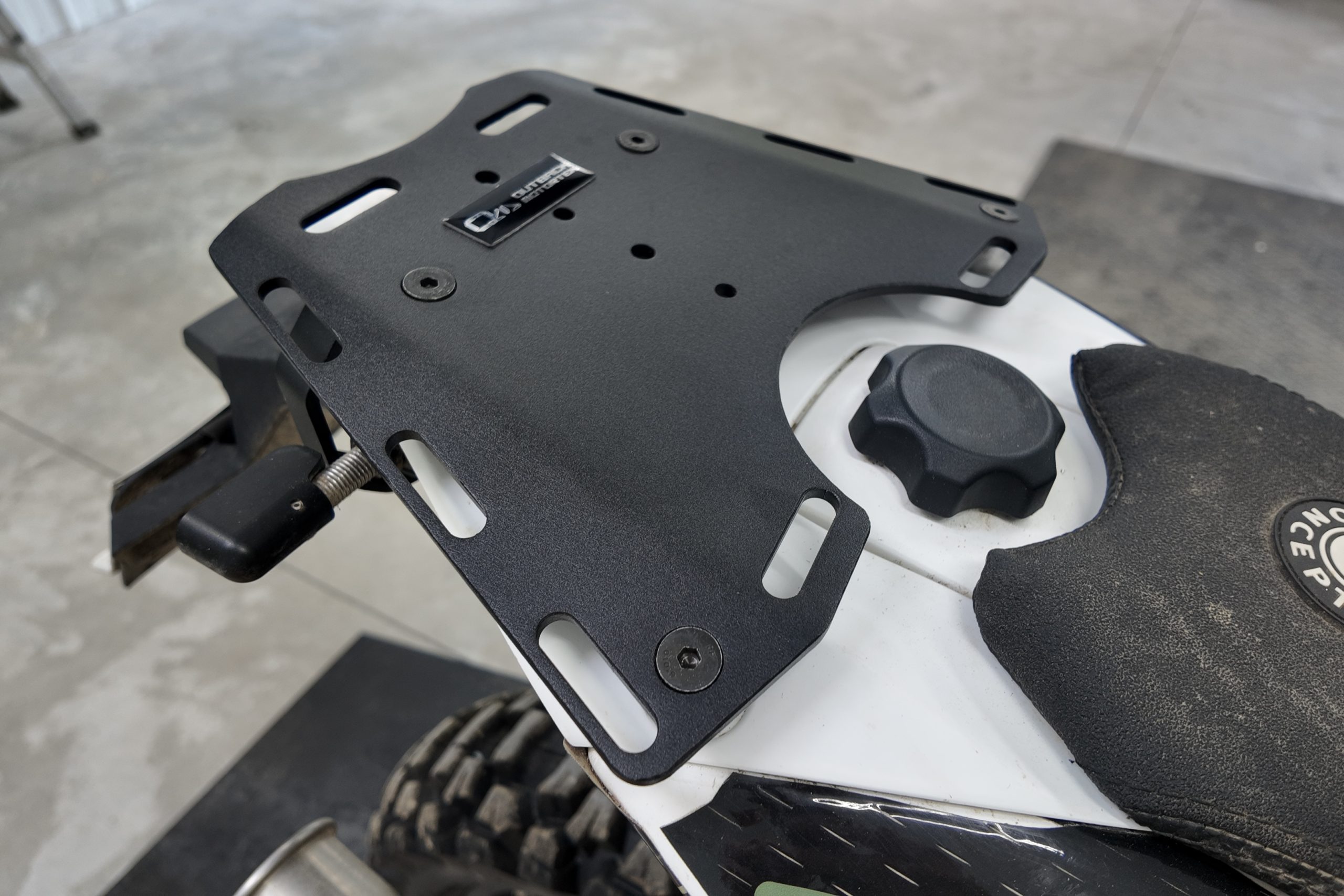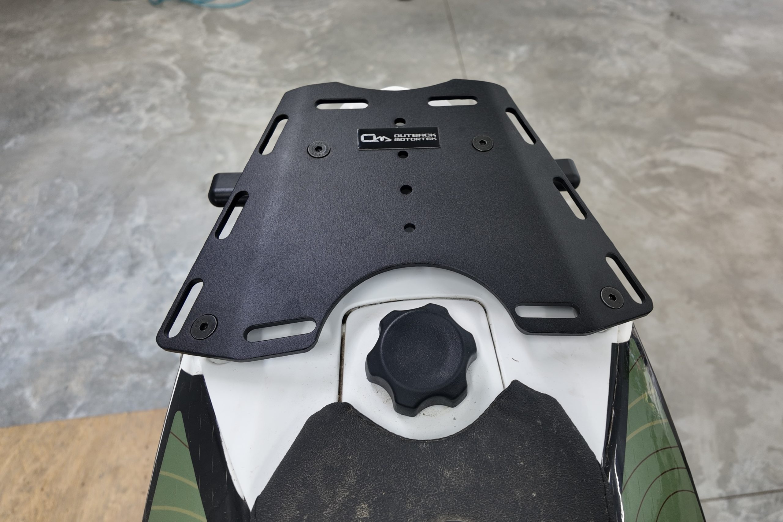 Outback Motortek designed a reinforced rear luggage rack for the Kove 450 Rally that is strong and very functional. We’ve added a rear support platform and holes that are large enough for technically any tie down straps or bungee cord to help you secure a bag, tent etc. on it.